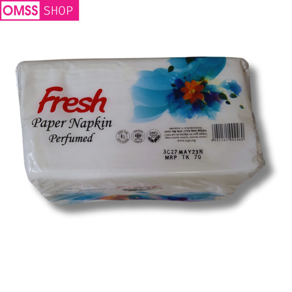 এটি একটি ফ্রেশ পারফিউম্ড পেপার ন্যাপকিন এর প্যাকেট। এই পেপার ন্যাপকিন টি ফ্রেশ কোম্পানি তৈরি করেছে। এই পেপার ন্যাপকিন এর প্যাকেট এ ১০০ টি ন্যাপকিন আছে। এই পেপার ন্যাপকিন টির সাইজ ১৩”X১৩”। এই ফ্রেশ পেপার ন্যাপকিন টিতে অনেক সুন্দর পারফিউম ব্যবহার করা হয়েছে। এই পেপার ন্যাপকিন টি কোন প্রকার হাতের স্পর্শ ছাড়াই তৈরি হয়েছে।